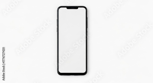 Modern smartphone lies flat, screen blank and bright against white backdrop