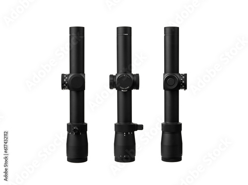 Modern sniper scope on a white back. Optical device for aiming and shooting at long distances.