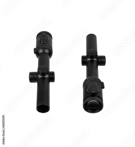 Modern sniper scope on a white back. Optical device for aiming and shooting at long distances.