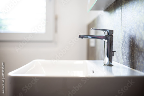 Modern square bathroom wash basin or sink and chrome water faucet. Wide angle, side view, shallow depth of field, natural window light, no people