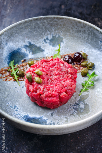 Modern Style Gourmet Tartar roh vom Rinderfilet mit Kapern und Amarena Kirschen serviert mit Trüffelcreme und Salat als close-up in einer Nordic Design Schale