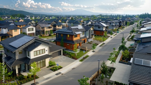 Modern Suburban Neighborhood with Solar-Powered Homes and Bright Autumn Trees