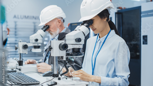 Modern Technology Concept: Two Scientists Examining Small Scale Industrial Equipment Parts Through a Microscope. Technicians Testing New Factory Components for Quality.