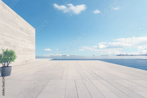 Modern terrace with plant near tranquil water under clear blue sky