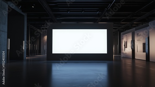 Modern Theater Stage with Bright Screen And Dim Lighting. Perfect for media displays, presentations, and performances in a contemporary setting.