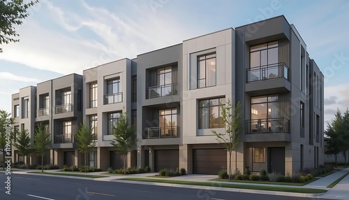 Modern Townhomes Grey Facade Evening Light Exterior Design