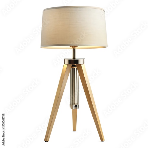 Modern tripod lamp with beige shade and wooden legs isolated on white background
