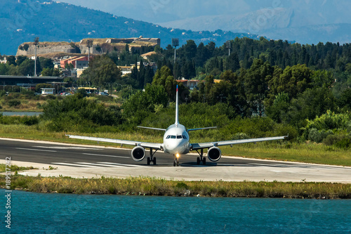 Modern twin-engine passenger airplane taxiing for take off at Corfu Ioannis Kapodistrias international airport.