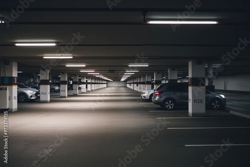 Modern Underground City Car Park with Neon Lighting – Large Industrial Interior with Concrete Floors, Rows of Vehicles