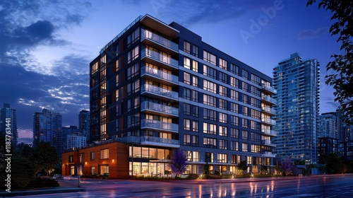 Modern Urban Apartment Building at Dusk with City Skyline Background