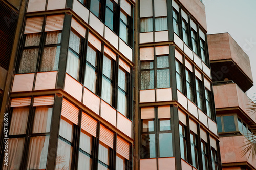 Modern urban architecture tall building with big windows In city area.