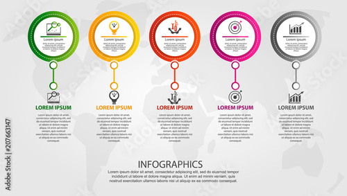 Modern vector illustration. Infographic template with five elements, circles and text. Step by step. Designed for business, presentations, web design, diagrams with 5 steps