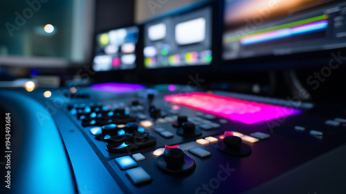 Modern video production workstation with editing console and digital timeline screens broadcast editing studio scene showing a professional media workstation equipped with a video