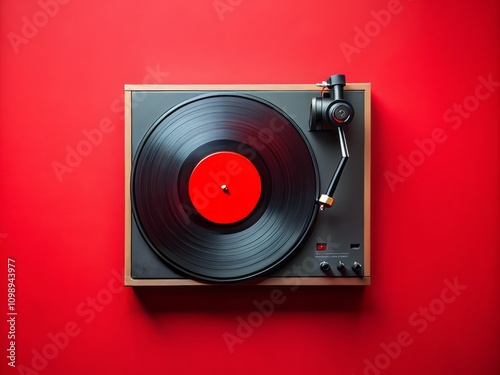 Modern Vinyl Record Player on Red Background: Capturing the Nostalgia of Analog Music with Space for Text in a Top View Perspective