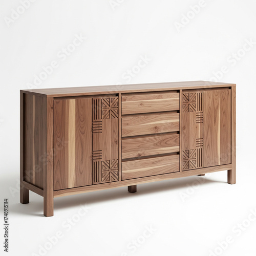 Modern Walnut Sideboard with Carved Geometric Doors – Minimalist Scandinavian Wooden Storage Cabinet