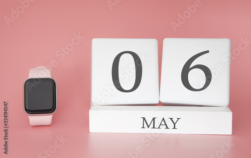 Modern Watch with cube calendar and date 06 may on pink background. Concept spring time vacation.