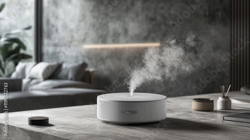 Modern white aroma diffuser on table, emitting steam in a stylish living room.