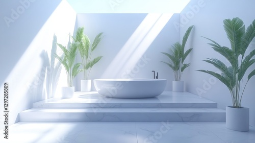 Modern white bathroom with plants, sunlight, and steps