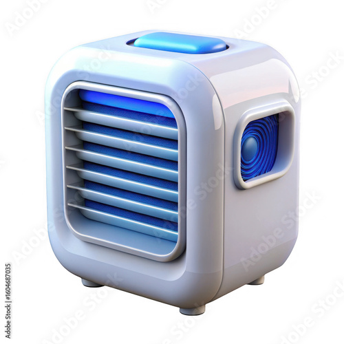 Modern white cube shaped personal air cooler with blue illuminated vents and a blue top button isolated on transparent background