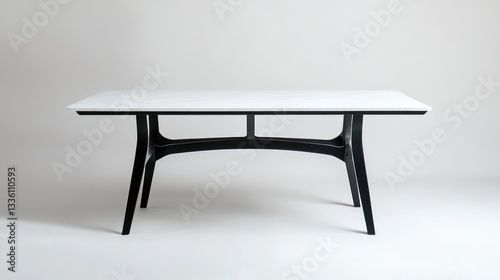Modern white marble dining table against white background. Possible use Interior design, furniture catalog