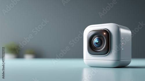 Modern white security camera with lens on grey background, under soft clean light highlighting surveillance and tech, serene minimal scene, clear camera lighting, with copy space