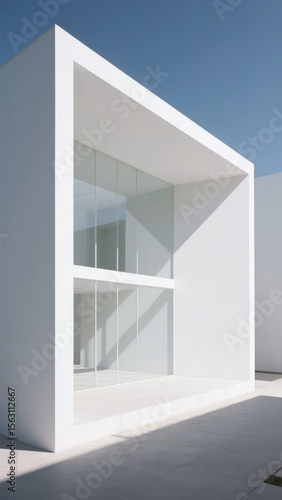 Modern White Structure with Glass Panels and Clear Blue Sky