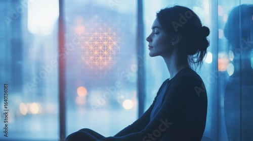 Modern woman in minimalist office, Flower of Life - sacred geometry overlay, spiritual awareness in corporate daily work setting