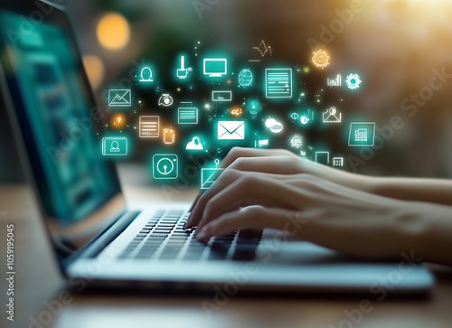 Modern Woman Working on Laptop with Floating Digital Icons Representing Technology : Generative AI