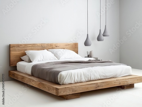 Modern wooden bed frame with understorage, in a sleek monochromatic bedroom