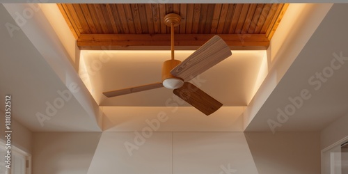 Modern wooden ceiling fan in a contemporary interior, emphasizing style and lighting design