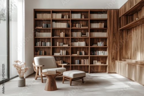 Modern wooden library with beige armchair and ottoman