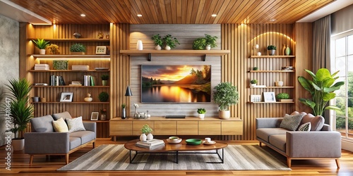 Modern Wooden TV Wall Design with Shelves and Decorative Elements in a Cozy Living Room Setting