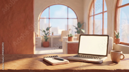 Modern workspace featuring laptop, notebook, and coffee cup, surrounded by plants and natural