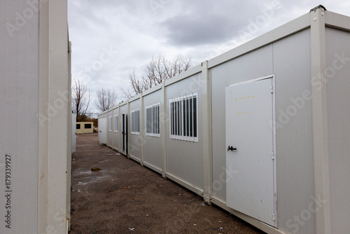Modular containers at a construction site. Stacked units form temporary offices and storage. Bright, industrial setting with construction materials