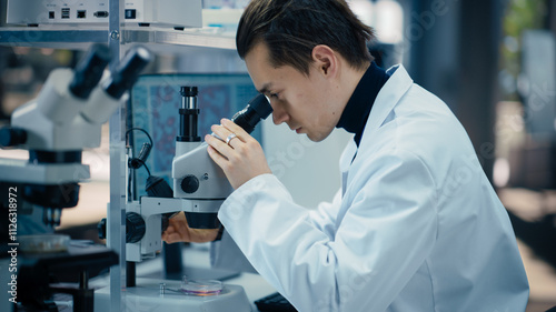 Molecular Biology Research Scientist Looking at a DNA Sample Under a Microscope in an Applied Science Laboratory. Portrait of a Young Lab Engineer in White Coat Working on Vaccine Products