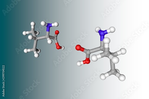 Molecular structure of valine. Atoms are represented as spheres with conventional color coding: carbon (grey), oxygen (red), nitrogen (light blue), hydrogen (white). 3d illustration