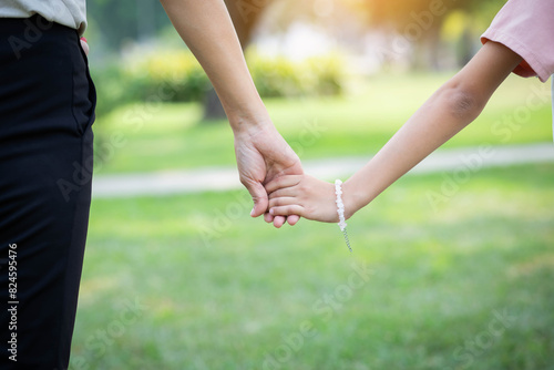 Mom and her child holding hands in park, closeup