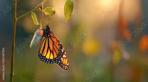 Monarch Butterfly Emerging from Chrysalis, Transformation Concept, New Life, Summer Season, Blurred Background