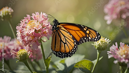 Monarch butterfly feeding on an orange flower, showcasing its beautiful wings in a summer garden close-up