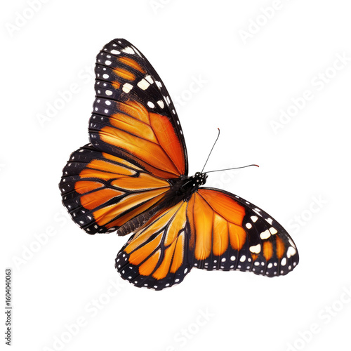 Monarch butterfly, vibrant orange and black wings, isolated against black background