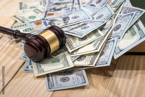 Money and judges hammer on wooden table