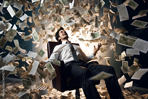 Money Rain. Professional Businessman Manager celebrating Success, sitting in a Chair. Rich Guy. Big Winner Profit Concept.