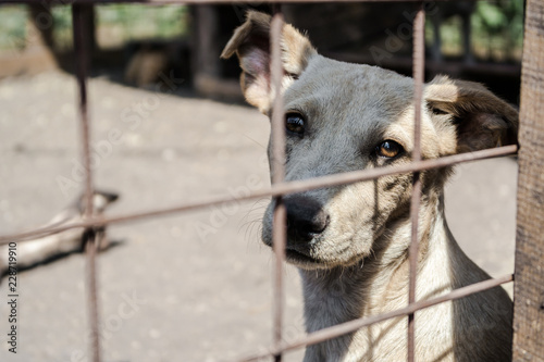 mongrel dog with sad eyes sitting in a cage