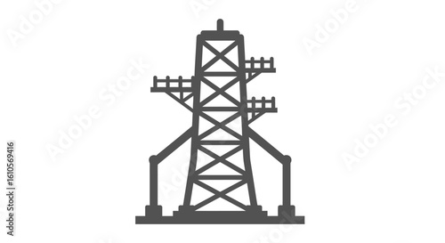 Monochromatic grey silhouette of an industrial launch tower or oil derrick with a lattice structure.