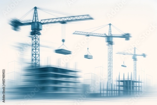 Monochromatic image showcases construction cranes in motion against a muted cityscape backdrop.