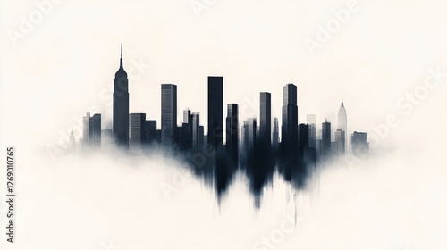 monochromatic skyline with skyscrapers emerging from fog, creating an abstract, almost dreamlike cityscape.