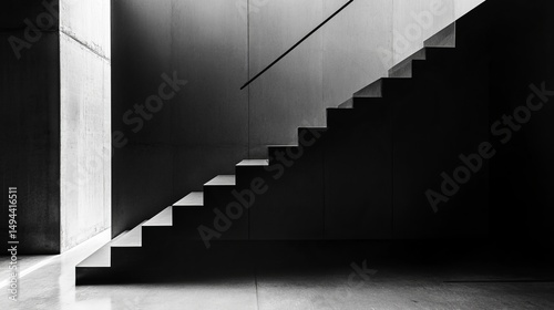 Monochrome architectural photo of upward stairs, dramatic shadows, geometric composition