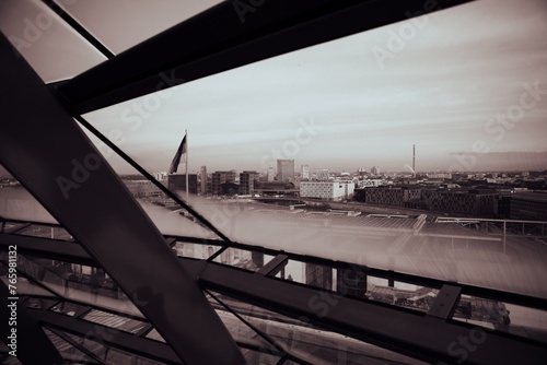 Monochrome cityscape viewed through geometric window frames, showcasing urban architecture under a hazy sky.