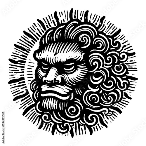 Monochrome Face Graphic with Curly Hair and Radiating Lines Antique Design