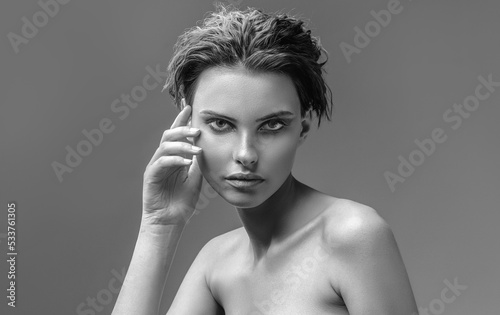 Monochrome glamor portrait of young women. Young sensual model girl posing in studio.